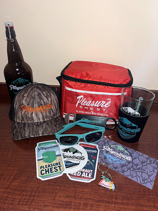 This Playalinda Brewing Company bundle contains a soft sided cooler, logo pint, pint koozie, camo hat, stickers, 32oz growler, certificate for a 32oz growler fill, sunglasses, bottle opener, and keychain.